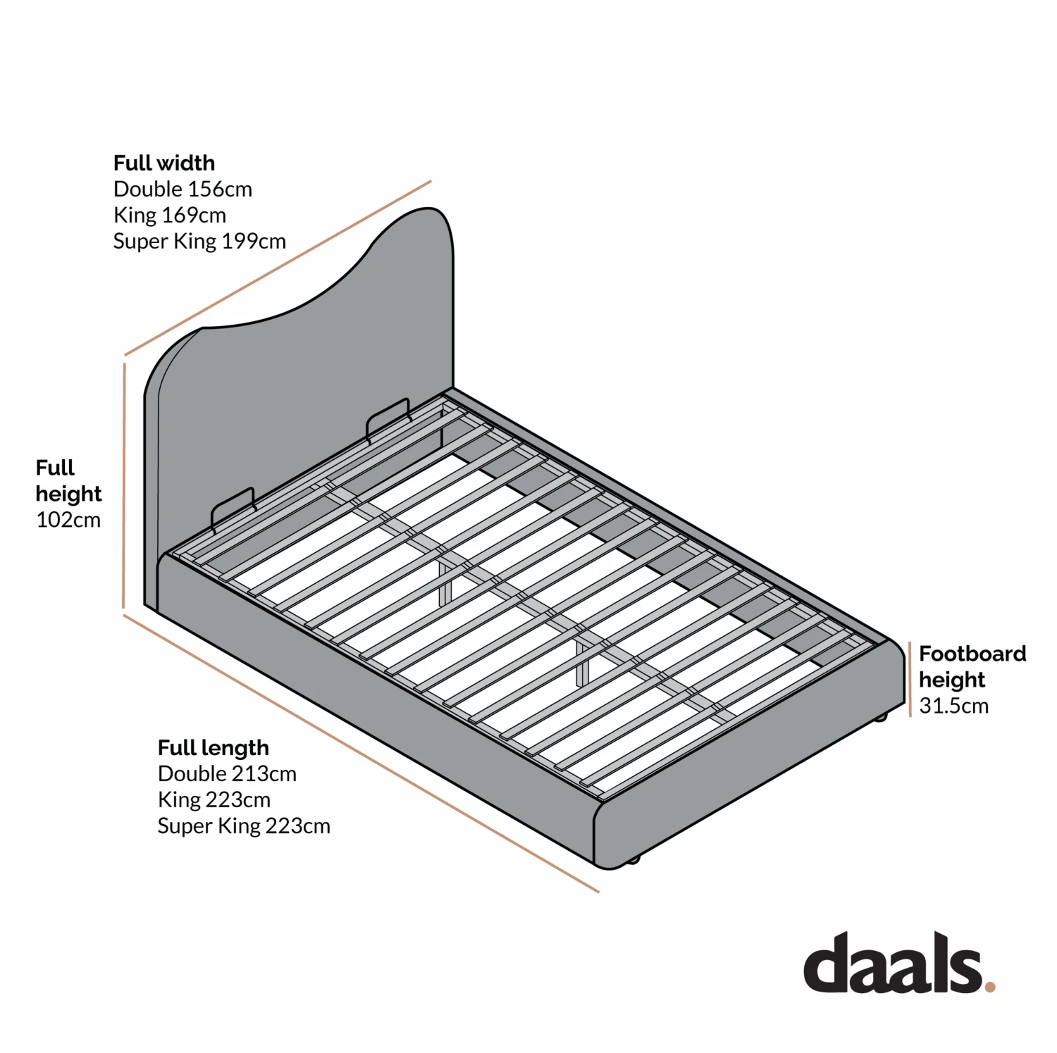 - 6FT Super King: WÂ 199 x D 223 x H 102 cm